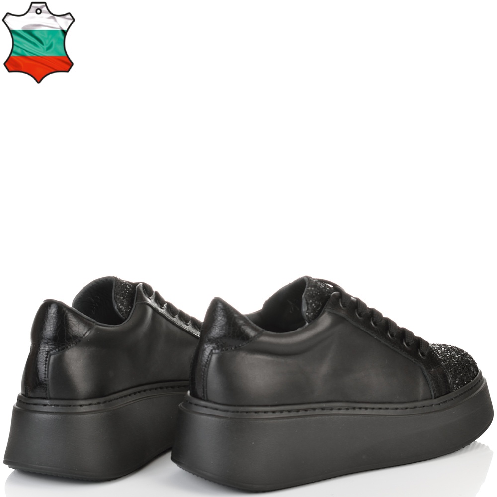Уникални и неповторими кецове на високо повдигнато ходило с ефектен черен брокат, в нежно съчетание на черна естествена кожа и черен естествен лак. Блясъкът винаги е на мода, а с тези кецове просто ще заблестите. Вътрешната част на модела също е изцяло от естествена кожа, а стелката е Footbed, която е изключително мека и се оформя по стъпалото на принципа на мемори пяна. В допълнение моделът е с олекотено полиуретаново ходило, шито и лепено, което перфектно допълва комфорта на модела и следва естествената линия на движение на краката. С тях ще бъдете просто неотразима.