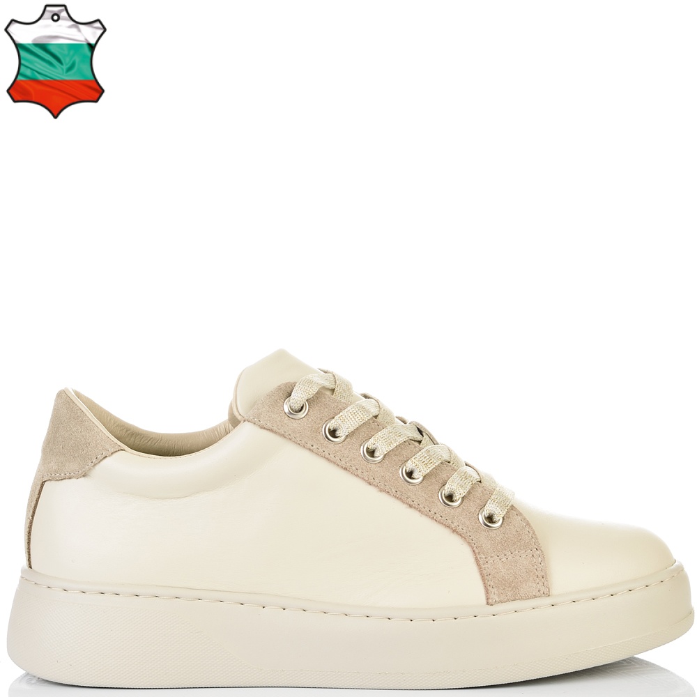 Класически модел дамски кецове в нежно съчетание на бежова естествена кожа и бежов естествен велур. С избора на този модел няма как да се сгреши, винаги модерни, лесно се съчетават с всякакъв тип облекло и изключително леки и удобни. Вътрешната част на модела също е изцяло от естествена кожа, а стелката е Footbed, която е изключително мека и се оформя по стъпалото на принципа на мемори пяна. В допълнение моделът е с олекотено полиуретаново ходило, шито и лепено, което перфектно допълва комфорта на модела и следва естествената линия на движение на краката. С тях ще бъдете просто неотразима.