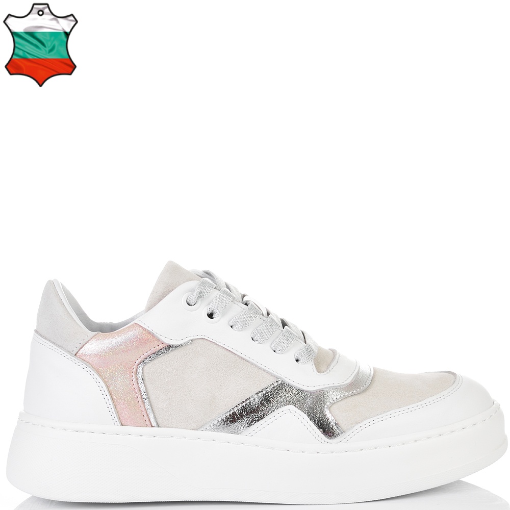 Стлни и нежни кецове в съчетание на бяла естествена кожа, бял велур и ефектни свежи цветове на хамелеонова пудра и сребристо. Моделът ще допринесе много свежест и стил във вашата визия. Вътрешната част на модела също е изцяло от естествена кожа, а стелката е Footbed, която е изключително мека и се оформя по стъпалото на принципа на мемори пяна. В допълнение моделът е с олекотено полиуретаново ходило, шито и лепено, което перфектно допълва комфорта на модела и следва естествената линия на движение на краката.