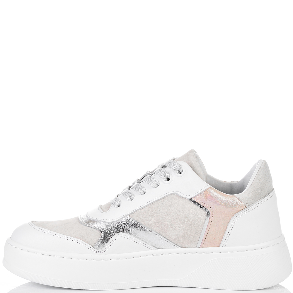 Стлни и нежни кецове в съчетание на бяла естествена кожа, бял велур и ефектни свежи цветове на хамелеонова пудра и сребристо. Моделът ще допринесе много свежест и стил във вашата визия. Вътрешната част на модела също е изцяло от естествена кожа, а стелката е Footbed, която е изключително мека и се оформя по стъпалото на принципа на мемори пяна. В допълнение моделът е с олекотено полиуретаново ходило, шито и лепено, което перфектно допълва комфорта на модела и следва естествената линия на движение на краката.