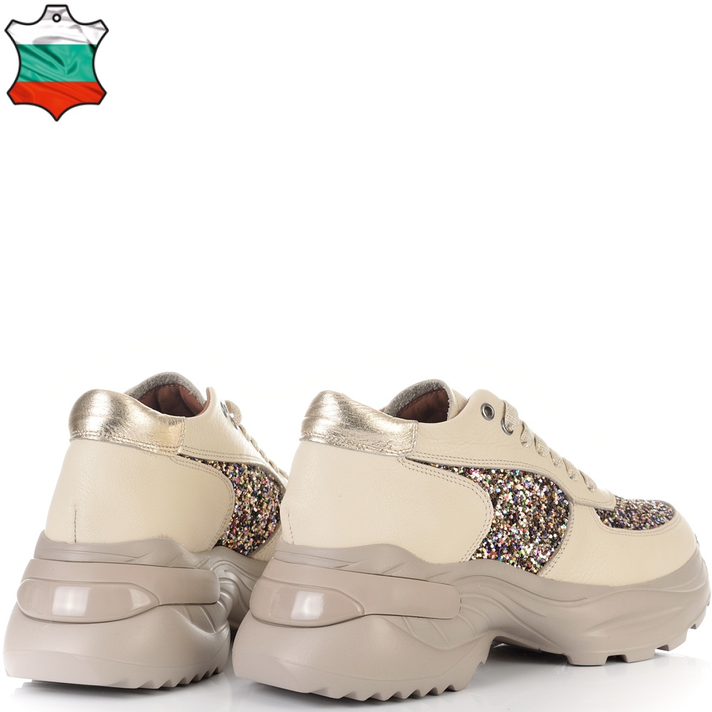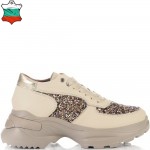 Невероятни дамски сникърси от естествена кожа - бежов шегрен в съчетание с ефектен брокат в различни цветове. Блясъкът винаги е на мода, а с тези кецове просто ще заблестите. Вътрешната част на модела също е изцяло от естествена кожа, а стелката е Footbed, която е изключително мека и се оформя по стъпалото на принципа на мемори пяна. В допълнение моделът е с олекотено полиуретаново ходило, шито и лепено, което перфектно допълва комфорта на модела и следва естествената линия на движение на краката. С тях ще бъдете просто неотразима.