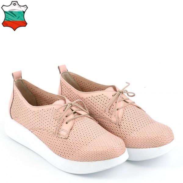 Дамски обувки на лека и стабилна платформа с лазерна перфорация в нежен цвят пудра, изключително удобни. Перфектен избор за ежедневната ти визия, защото лесно се съчетават с всякакви тоалети от дънки и панталони до рокли и поли, също така са подходящи както за пролетта, така и за лятото, заради дупките от перфорацията. Стелката на модела е с три меки зони – пета, свод и възглавничка, а ходилото е изключително леко, защото е изработено от олекотен полиуретан, което перфектно допринася за цялостния комфорт на модела.
