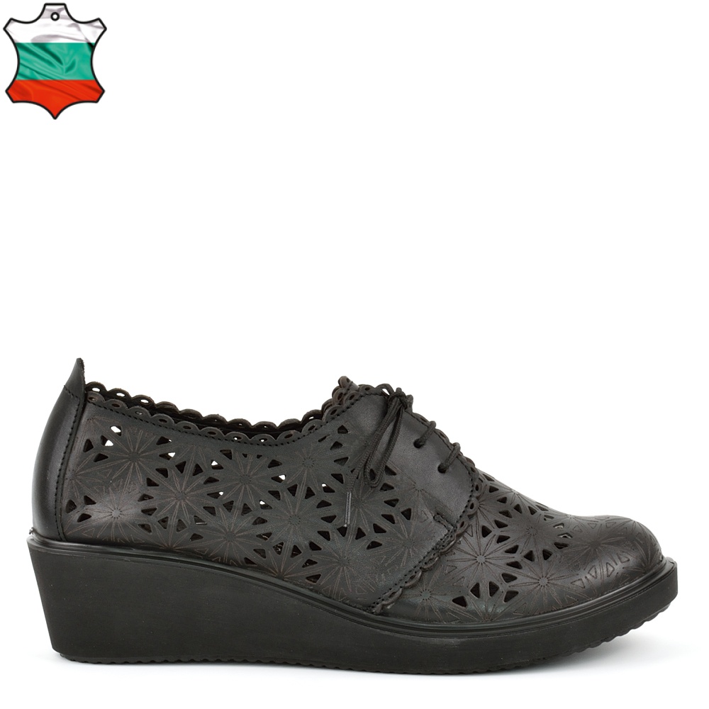 Българси дамски обувки на платформа в класическо черно с лазарна перфорация, изцяло от естествена кожа отвътре и отвън. Моделът е с анатомична подметка, меки, леки и невероятно удобни. Перфектният избор за ежедневието. Стелката на модела е с три меки зони – пета, свод и възглавничка, а ходилото е изключително леко, защото е изработено от олекотен полиуретан, което перфектно допринася за цялостния комфорт на модела.