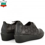 Българси дамски обувки на платформа в класическо черно с лазарна перфорация, изцяло от естествена кожа отвътре и отвън. Моделът е с анатомична подметка, меки, леки и невероятно удобни. Перфектният избор за ежедневието. Стелката на модела е с три меки зони – пета, свод и възглавничка, а ходилото е изключително леко, защото е изработено от олекотен полиуретан, което перфектно допринася за цялостния комфорт на модела.