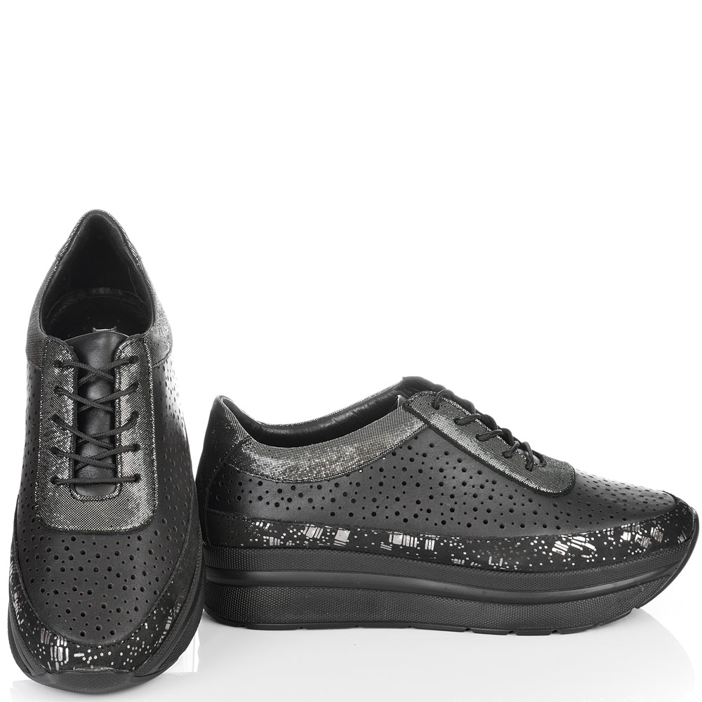 Дамски обувки на цялостна платформа с лазерна перфорация в нежно съчетание на черно и ефектни бронзови кожи. Перфектен избор, защото са подходящи както за пролетта така и за лятото, заради самата перфорацията, а и лесно се съчетават с всякакви тоалети от дънки и панталони, до поли и рокли. Стелката на модела е мека, а ходилото е олекотено полиуретаново, което е много стабилно и перфектно допринася за цялостния комфорт на модела.