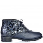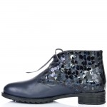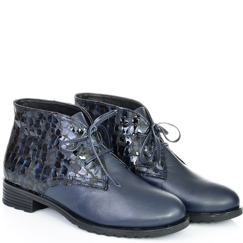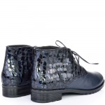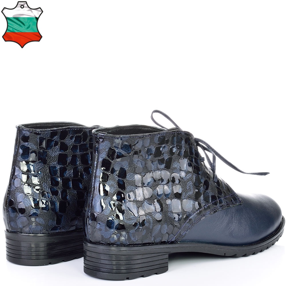 Дамски кларкове от естествена кожа тъмно сини, с кожени връзки и ефектна кожа. Вътрешната част на модела е с тънък, мек и топъл хастар. Ходилото е каучук и е изключително стабилно и не се пързаля на заледени и заснежени участъци. Този модел е перфектният избор за Вашата ежедневна визия