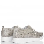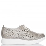 Класически модел дамски обувки на платформа с лазерна перфорация в сребърно. Перфектен избор за ежедневната ти визия, защото лесно се съчетават с всякакви тоалети от дънки и панталони до рокли и поли, също така са подходящи както за пролетта, така и за лятото, заради дупките от перфорацията. Стелката на модела е с три меки зони – пета, свод и възглавничка, а ходилото е изключително леко, защото е изработено от олекотен полиуретан, което перфектно допринася за цялостния комфорт на модела.
