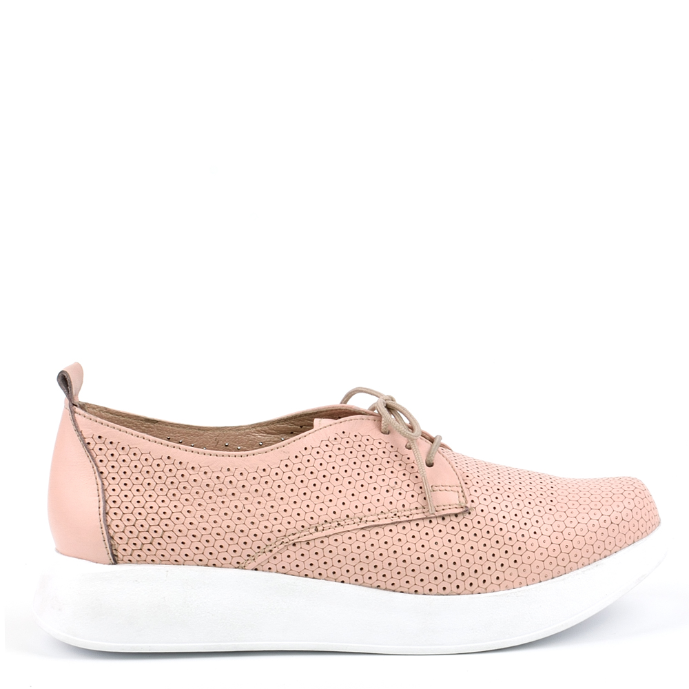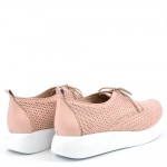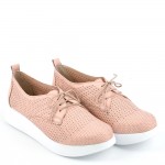 Дамски обувки на лека и стабилна платформа с лазерна перфорация в нежен цвят пудра, изключително удобни. Перфектен избор за ежедневната ти визия, защото лесно се съчетават с всякакви тоалети от дънки и панталони до рокли и поли, също така са подходящи както за пролетта, така и за лятото, заради дупките от перфорацията. Стелката на модела е с три меки зони – пета, свод и възглавничка, а ходилото е изключително леко, защото е изработено от олекотен полиуретан, което перфектно допринася за цялостния комфорт на модела.
