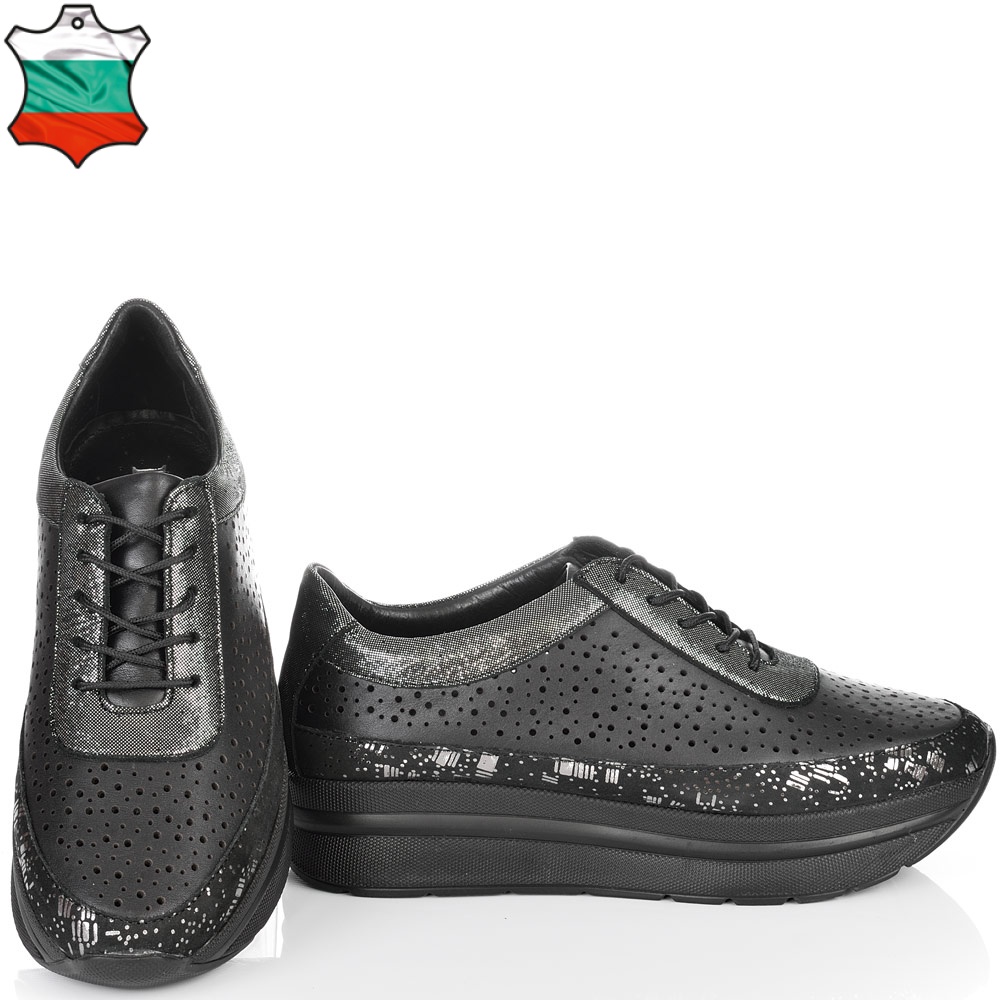 Дамски обувки на цялостна платформа с лазерна перфорация в нежно съчетание на черно и ефектни бронзови кожи. Перфектен избор, защото са подходящи както за пролетта така и за лятото, заради самата перфорацията, а и лесно се съчетават с всякакви тоалети от дънки и панталони, до поли и рокли. Стелката на модела е мека, а ходилото е олекотено полиуретаново, което е много стабилно и перфектно допринася за цялостния комфорт на модела.