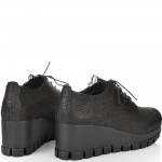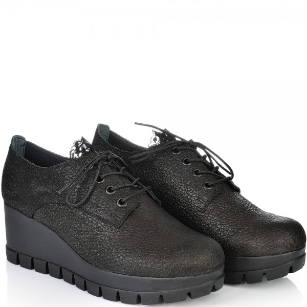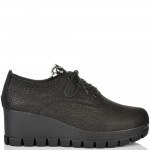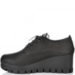 Дамски ежедневни обувки на платформа с връзки и дантела на езика в страхотна ефектна черна кожа. Моделът изключително стилен и удобен и лесно се съчетава с всякакъв тип тоалети. Стелката е мека и се оформя по стъпалото на принципа на мемори пяна. Моделът е много лек, защото е изработен от полиуретаново ходило, което следва естествената линия на движение на походк