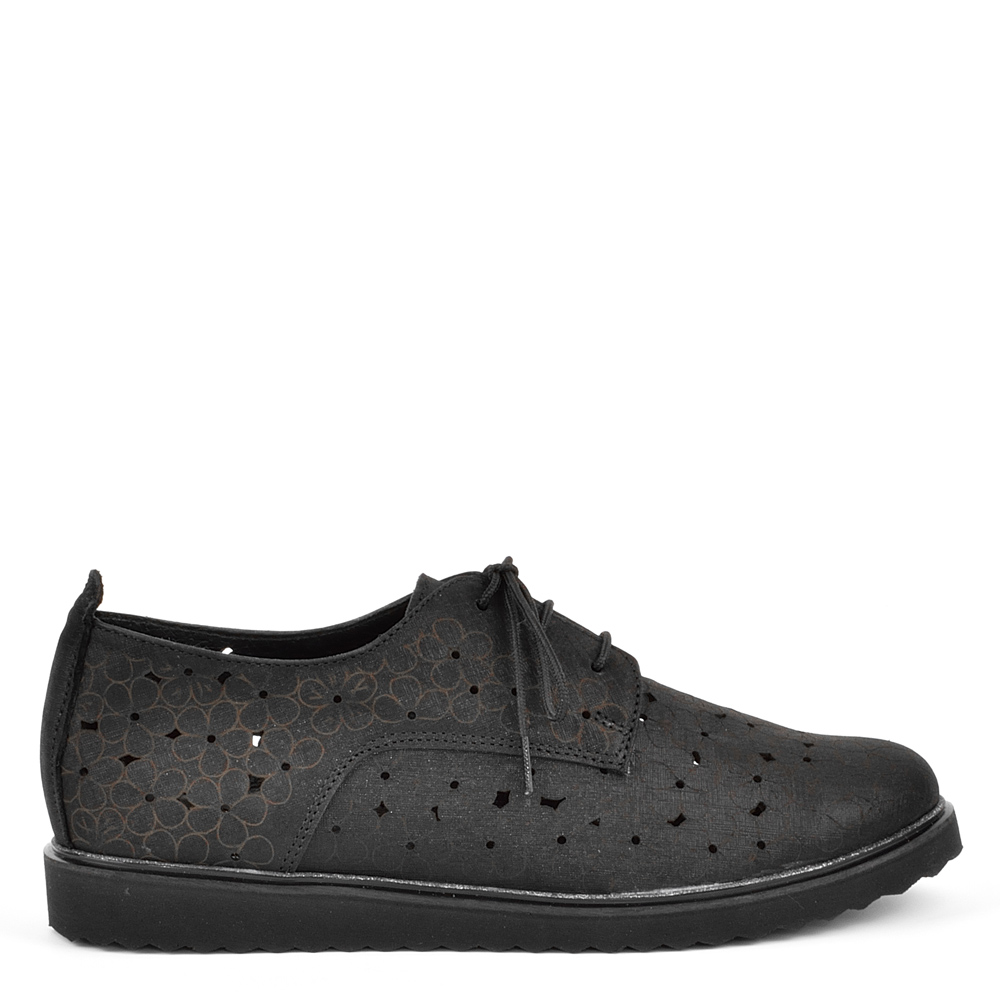 Изключително леки, меки и на олекотено ходило, тези обувки с лазерна изработка и ефектна кожа в черен цвят са перфектният избор за Вашия ежедневен комфорт. Подходящи са както за пролетта така и за лятото, заради перфорацията и лесно се съчетават с всякакви тоалети от дънки и панталони до поли и рокли. А ходилото е леко меко и изолирано и следва естествената линия на походката, а така комфорта ще Ви следва навсякъде.