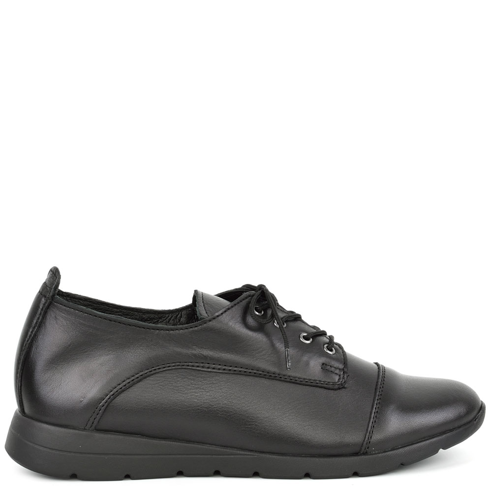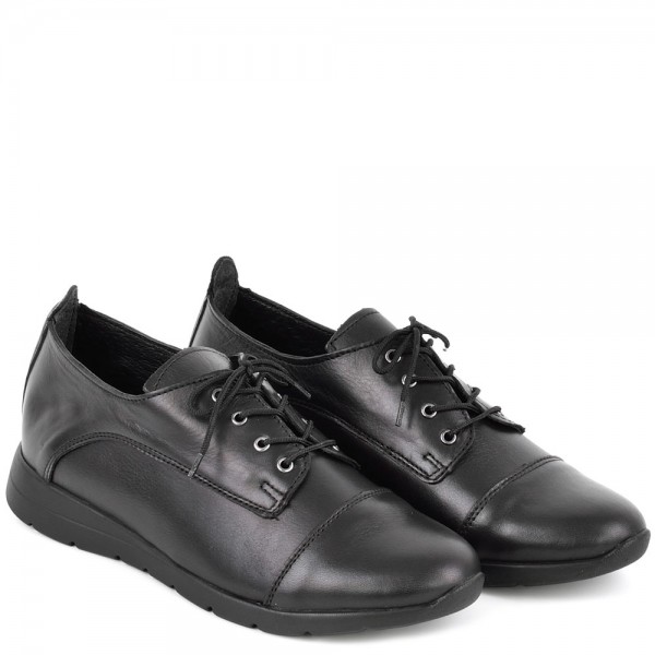 Дамски обувки от естествена кожа в черен цвят. Висококачествената естествена кожа и перфектната изработка, придават стил и елегантност на модела. Тези обувки са подходящи за ежедневието, защото лесно се съчетава с много тоалети от рокли и поли, до дънки и панталони. Ходилото следва естествената линия и движения на походката.