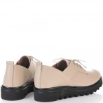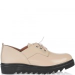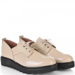 Дамски ежедневни обувки с връзки в съчетание на бежов лак с бежова кожа. Моделът изключително стилен и удобен и лесно се съчетава с всякакъв тип тоалети. Стелката е мека и се оформя по стъпалото на принципа на мемори пяна. Моделът е много лек, защото е изработен от олекотено полиуретаново ходило, което следва естествената линия на движение на походката.