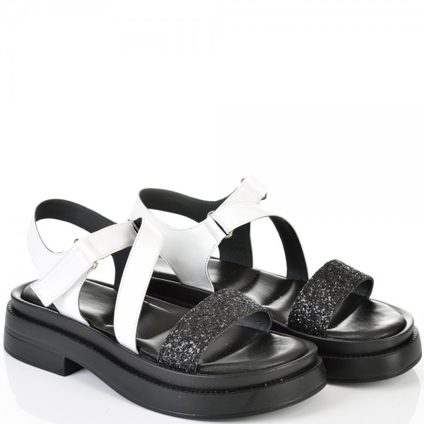 ДАМСКИ САНДАЛИ ОТ ЕСТЕСТВЕНА КОЖА И БРОКАТ-6008A-ЧЕРНО/БЯЛО