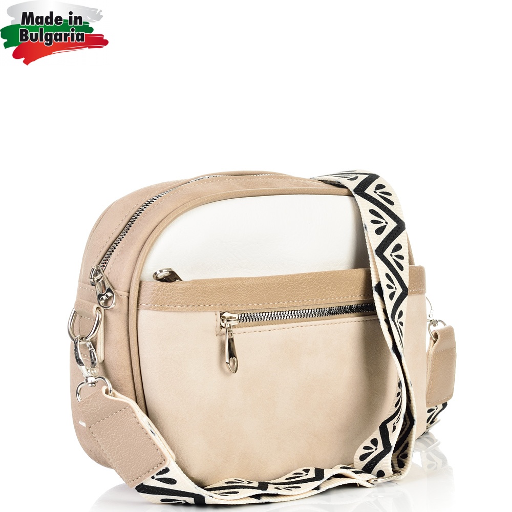 Етикети: еко кожа, българско производство, дамска чанта, дамска чанта през рамо, дълга дръжка, дръжка от плат, шарена дръжка