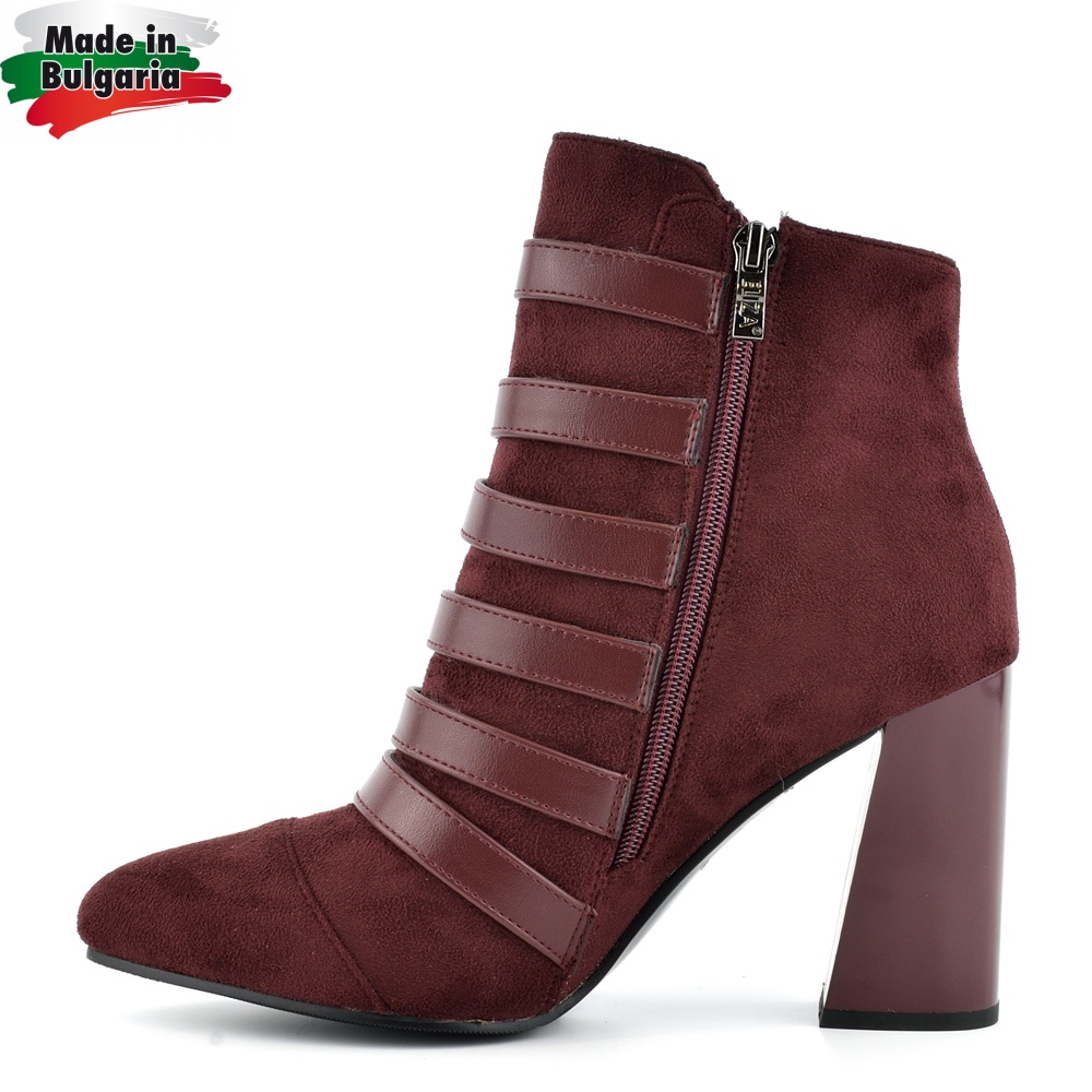 Български дамски боти от велур и еко кожа на висок и стабилен ток с каишки в цвят бордо. Моделът е леко заострен напред и е подходящ за дами с тъник и слаб глезен.