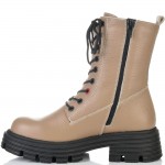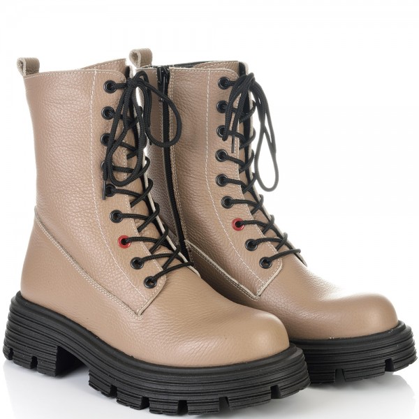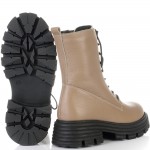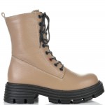 Страхотни боти от естествена кожа - мек шегрен в бежов цвят страхотно съчетани с черно ходило. Кожата на този модел е много мека и страхотно се оформя по крака, също така за по-голямо удобство моделът има връзки и цип за лесно пристягане и оформяне по крака, веднъж настроени връзките след това ботите се събуват и обуват само с ципа. Тези боти ще осигурят нужния Ви комфорт, топлина и удобство през целия ден, защото вътрешната част на модела е с тънък, мек и топъл хастар подходящ за зимата. В допълнение моделът е с олекотено термокаучуково ходило и дебел гарйфер, което е много стабилно и не се пързаля на заледени и заснежени участъци.