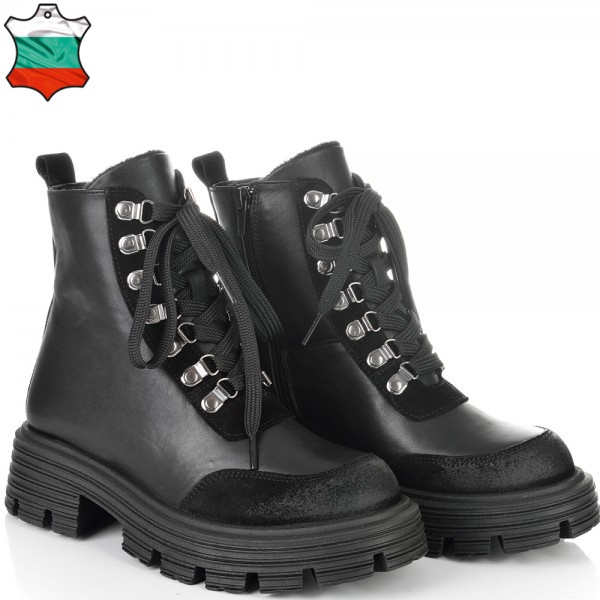 Невероятни боти от естествена кожа и елементи от естествен набук в черен цвят страхотно съчетани с модерно ходило. Кожата на този модел е много гладка и страхотно се оформя по крака, също така за по-голямо удобство моделът има връзки и цип за лесно пристягане и оформяне по крака, веднъж настроени връзките след това ботите се събуват и обуват само с ципа. Тези боти ще осигурят нужния Ви комфорт, топлина и удобство през целия ден, защото вътрешната част на модела е с тънък, мек и топъл хастар подходящ за зимата. В допълнение моделът е с олекотено термокаучуково ходило и дебел гарйфер, което е много стабилно и не се пързаля на заледени и заснежени участъци.