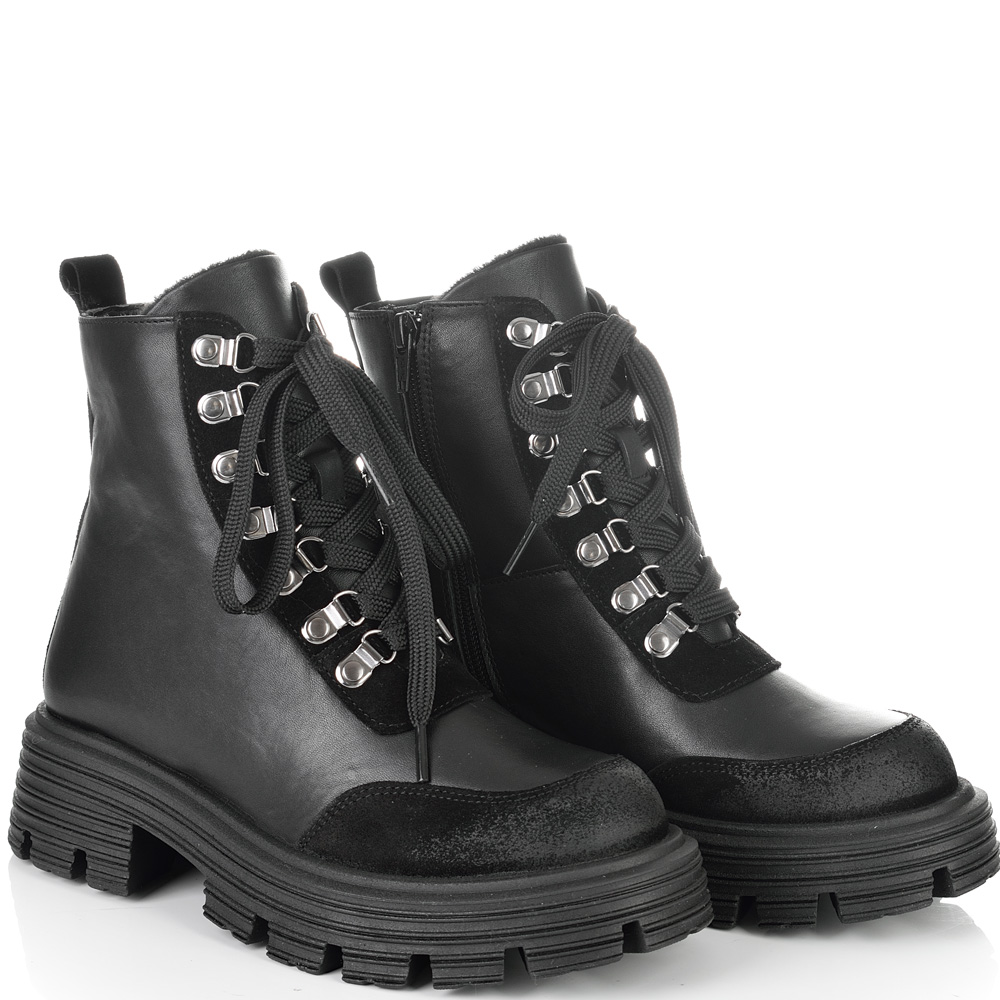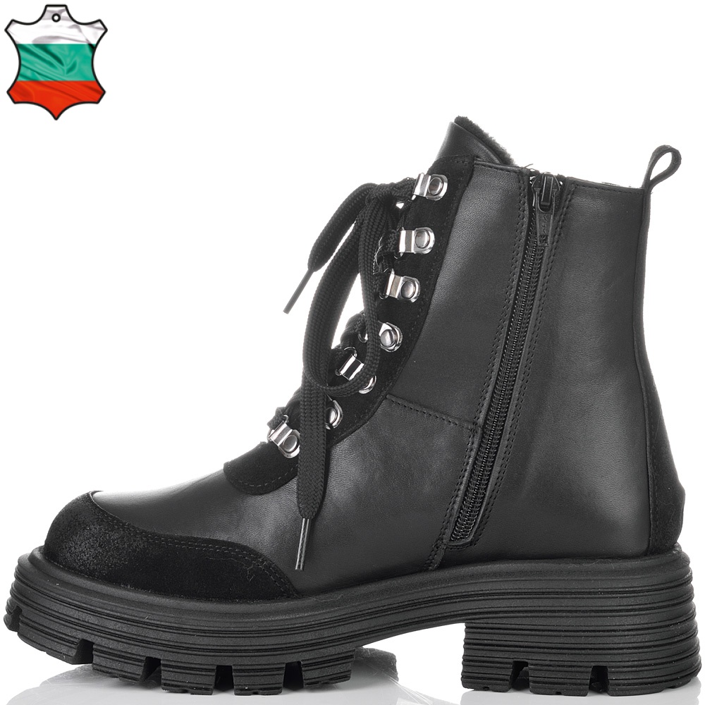Невероятни боти от естествена кожа и елементи от естествен набук в черен цвят страхотно съчетани с модерно ходило. Кожата на този модел е много гладка и страхотно се оформя по крака, също така за по-голямо удобство моделът има връзки и цип за лесно пристягане и оформяне по крака, веднъж настроени връзките след това ботите се събуват и обуват само с ципа. Тези боти ще осигурят нужния Ви комфорт, топлина и удобство през целия ден, защото вътрешната част на модела е с тънък, мек и топъл хастар подходящ за зимата. В допълнение моделът е с олекотено термокаучуково ходило и дебел гарйфер, което е много стабилно и не се пързаля на заледени и заснежени участъци.