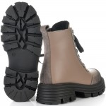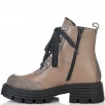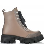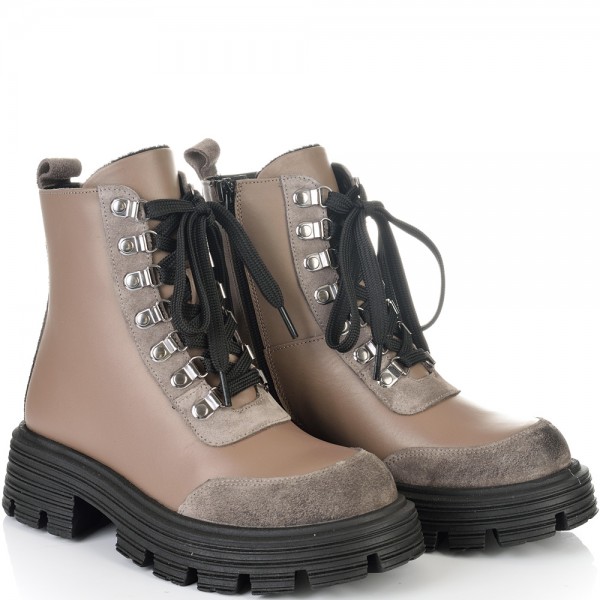 Невероятни боти от естествена кожа и елементи от естествен набук в цвят таупе страхотно съчетани с черно ходило. Кожата на този модел е много гладка и страхотно се оформя по крака, също така за по-голямо удобство моделът има връзки и цип за лесно пристягане и оформяне по крака, веднъж настроени връзките след това ботите се събуват и обуват само с ципа. Тези боти ще осигурят нужния Ви комфорт, топлина и удобство през целия ден, защото вътрешната част на модела е с тънък, мек и топъл хастар подходящ за зимата. В допълнение моделът е с олекотено термокаучуково ходило и дебел гарйфер, което е много стабилно и не се пързаля на заледени и заснежени участъци.