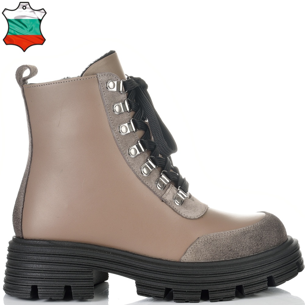 Невероятни боти от естествена кожа и елементи от естествен набук в цвят таупе страхотно съчетани с черно ходило. Кожата на този модел е много гладка и страхотно се оформя по крака, също така за по-голямо удобство моделът има връзки и цип за лесно пристягане и оформяне по крака, веднъж настроени връзките след това ботите се събуват и обуват само с ципа. Тези боти ще осигурят нужния Ви комфорт, топлина и удобство през целия ден, защото вътрешната част на модела е с тънък, мек и топъл хастар подходящ за зимата. В допълнение моделът е с олекотено термокаучуково ходило и дебел гарйфер, което е много стабилно и не се пързаля на заледени и заснежени участъци.