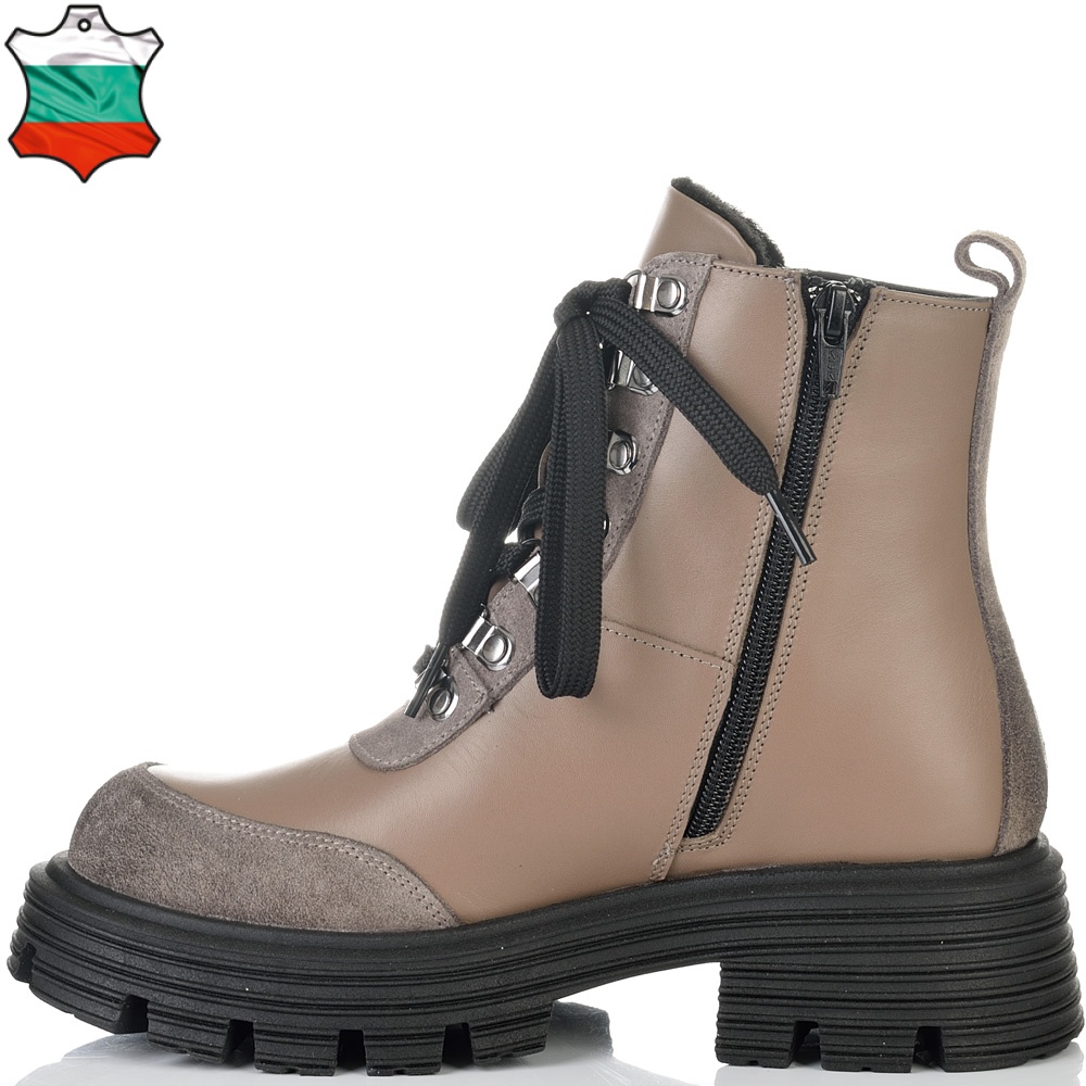 Невероятни боти от естествена кожа и елементи от естествен набук в цвят таупе страхотно съчетани с черно ходило. Кожата на този модел е много гладка и страхотно се оформя по крака, също така за по-голямо удобство моделът има връзки и цип за лесно пристягане и оформяне по крака, веднъж настроени връзките след това ботите се събуват и обуват само с ципа. Тези боти ще осигурят нужния Ви комфорт, топлина и удобство през целия ден, защото вътрешната част на модела е с тънък, мек и топъл хастар подходящ за зимата. В допълнение моделът е с олекотено термокаучуково ходило и дебел гарйфер, което е много стабилно и не се пързаля на заледени и заснежени участъци.