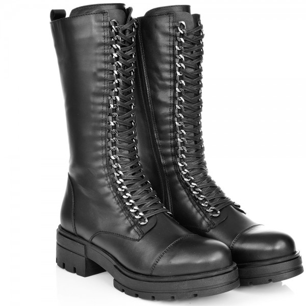 дамски ботуши от естествена кожа в класическо черно с ефектни връзки. Моделът е