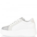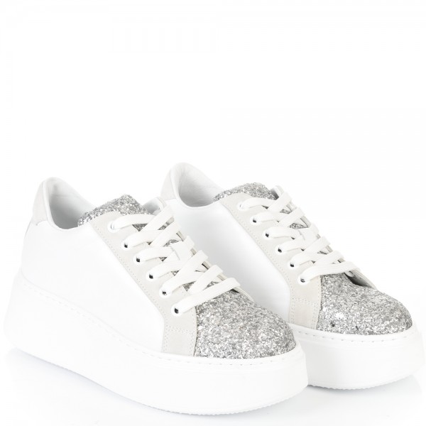 Уникални и неповторими кецове на високо повдигнато ходило с ефектен брокат в сребристо, в нежно съчетание на бяла естествена кожа и сив естествен велур. Блясъкът винаги е на мода, а с тези кецове просто ще заблестите. Вътрешната част на модела също е изцяло от естествена кожа, а стелката е Footbed, която е изключително мека и се оформя по стъпалото на принципа на мемори пяна. В допълнение моделът е с олекотено полиуретаново ходило, шито и лепено, което перфектно допълва комфорта на модела и следва естествената линия на движение на краката. С тях ще бъдете просто неотразима.