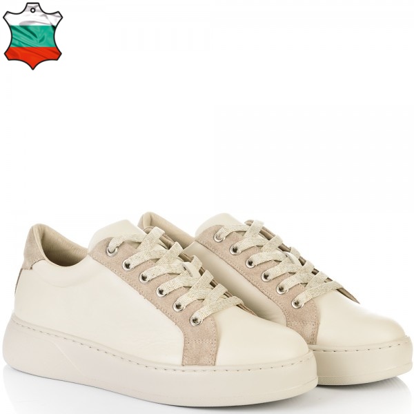 Класически модел дамски кецове в нежно съчетание на бежова естествена кожа и бежов естествен велур. С избора на този модел няма как да се сгреши, винаги модерни, лесно се съчетават с всякакъв тип облекло и изключително леки и удобни. Вътрешната част на модела също е изцяло от естествена кожа, а стелката е Footbed, която е изключително мека и се оформя по стъпалото на принципа на мемори пяна. В допълнение моделът е с олекотено полиуретаново ходило, шито и лепено, което перфектно допълва комфорта на модела и следва естествената линия на движение на краката. С тях ще бъдете просто неотразима.
