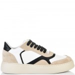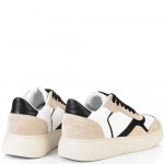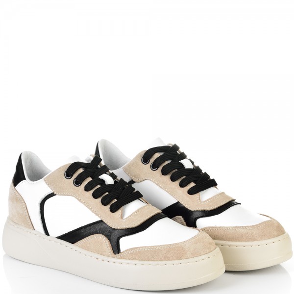 Стлен и страхотен нов модел. Кецовете са в нежно съчетание на бяла и черна кожа с бежов велур. Вътрешната част на модела също е изцяло от естествена кожа, а стелката е Footbed, която е изключително мека и се оформя по стъпалото на принципа на мемори пяна. В допълнение моделът е с олекотено полиуретаново ходило, шито и лепено, което перфектно допълва комфорта на модела и следва естествената линия на движение на краката.