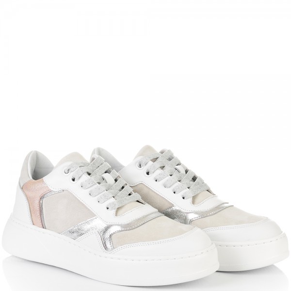 Стлни и нежни кецове в съчетание на бяла естествена кожа, бял велур и ефектни свежи цветове на хамелеонова пудра и сребристо. Моделът ще допринесе много свежест и стил във вашата визия. Вътрешната част на модела също е изцяло от естествена кожа, а стелката е Footbed, която е изключително мека и се оформя по стъпалото на принципа на мемори пяна. В допълнение моделът е с олекотено полиуретаново ходило, шито и лепено, което перфектно допълва комфорта на модела и следва естествената линия на движение на краката.