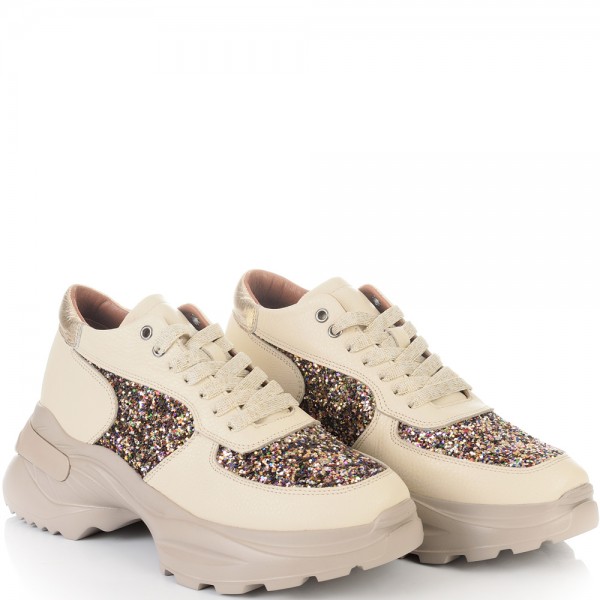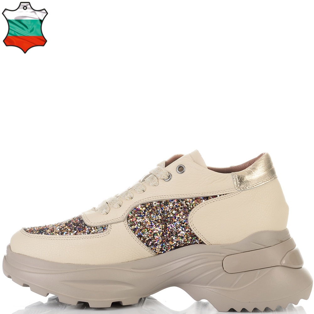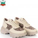 Невероятни дамски сникърси от естествена кожа - бежов шегрен в съчетание с ефектен брокат в различни цветове. Блясъкът винаги е на мода, а с тези кецове просто ще заблестите. Вътрешната част на модела също е изцяло от естествена кожа, а стелката е Footbed, която е изключително мека и се оформя по стъпалото на принципа на мемори пяна. В допълнение моделът е с олекотено полиуретаново ходило, шито и лепено, което перфектно допълва комфорта на модела и следва естествената линия на движение на краката. С тях ще бъдете просто неотразима.