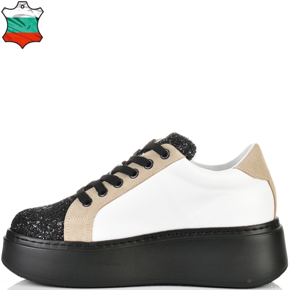 Уникални и неповторими кецове на високо повдигнато ходило с ефектен брокат в черен цвят, в нежно съчетание на бяла естествена кожа и бежов естествен велур. Блясъкът винаги е на мода, а с тези кецове просто ще заблестите. Вътрешната част на модела също е изцяло от естествена кожа, а стелката е Footbed, която е изключително мека и се оформя по стъпалото на принципа на мемори пяна. В допълнение моделът е с олекотено полиуретаново ходило, шито и лепено, което перфектно допълва комфорта на модела и следва естествената линия на движение на краката. С тях ще бъдете просто неотразима.