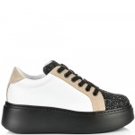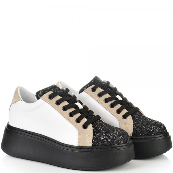 Уникални и неповторими кецове на високо повдигнато ходило с ефектен брокат в черен цвят, в нежно съчетание на бяла естествена кожа и бежов естествен велур. Блясъкът винаги е на мода, а с тези кецове просто ще заблестите. Вътрешната част на модела също е изцяло от естествена кожа, а стелката е Footbed, която е изключително мека и се оформя по стъпалото на принципа на мемори пяна. В допълнение моделът е с олекотено полиуретаново ходило, шито и лепено, което перфектно допълва комфорта на модела и следва естествената линия на движение на краката. С тях ще бъдете просто неотразима.