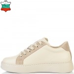 Класически модел дамски кецове в нежно съчетание на бежова естествена кожа и бежов естествен велур. С избора на този модел няма как да се сгреши, винаги модерни, лесно се съчетават с всякакъв тип облекло и изключително леки и удобни. Вътрешната част на модела също е изцяло от естествена кожа, а стелката е Footbed, която е изключително мека и се оформя по стъпалото на принципа на мемори пяна. В допълнение моделът е с олекотено полиуретаново ходило, шито и лепено, което перфектно допълва комфорта на модела и следва естествената линия на движение на краката. С тях ще бъдете просто неотразима.