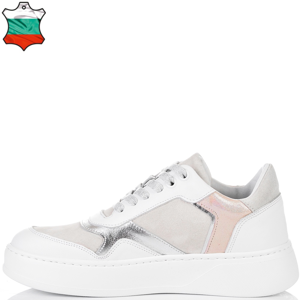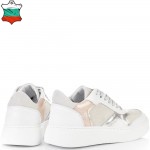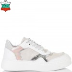 Стлни и нежни кецове в съчетание на бяла естествена кожа, бял велур и ефектни свежи цветове на хамелеонова пудра и сребристо. Моделът ще допринесе много свежест и стил във вашата визия. Вътрешната част на модела също е изцяло от естествена кожа, а стелката е Footbed, която е изключително мека и се оформя по стъпалото на принципа на мемори пяна. В допълнение моделът е с олекотено полиуретаново ходило, шито и лепено, което перфектно допълва комфорта на модела и следва естествената линия на движение на краката.