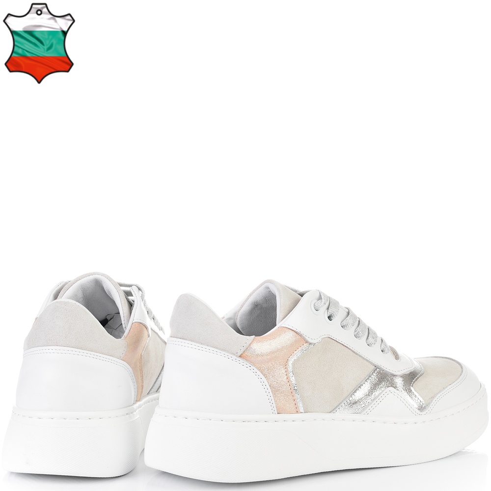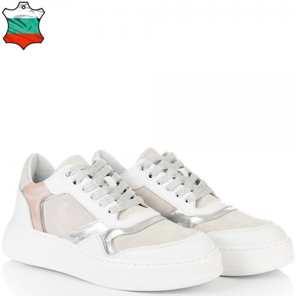 Стлни и нежни кецове в съчетание на бяла естествена кожа, бял велур и ефектни свежи цветове на хамелеонова пудра и сребристо. Моделът ще допринесе много свежест и стил във вашата визия. Вътрешната част на модела също е изцяло от естествена кожа, а стелката е Footbed, която е изключително мека и се оформя по стъпалото на принципа на мемори пяна. В допълнение моделът е с олекотено полиуретаново ходило, шито и лепено, което перфектно допълва комфорта на модела и следва естествената линия на движение на краката.