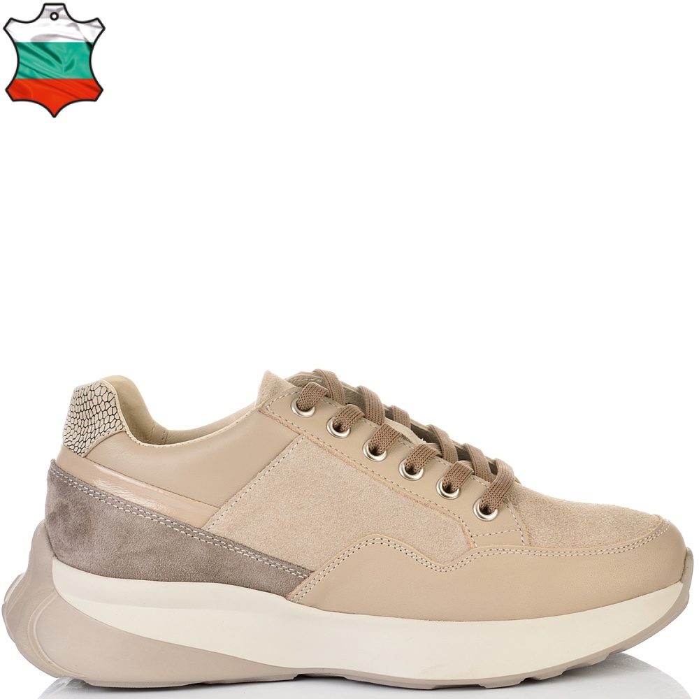 Стлни и нежни кецове в съчетание на различни варианти естествена кожа и велур в бежовата цветова гама на бежово ходило. Моделът ще допринесе завършеност и стил във вашата визия. Вътрешната част на модела също е изцяло от естествена кожа, а стелката е Footbed, която е изключително мека и се оформя по стъпалото на принципа на мемори пяна. В допълнение моделът е с олекотено полиуретаново ходило, шито и лепено, което перфектно допълва комфорта на модела и следва естествената линия на движение на краката.
