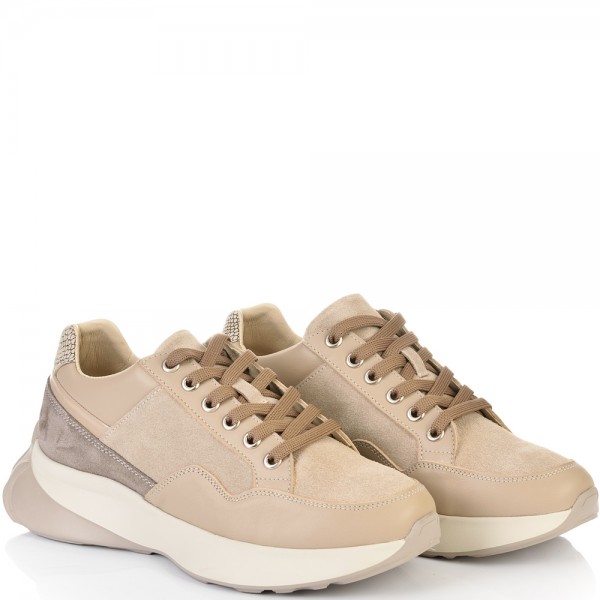 Стлни и нежни кецове в съчетание на различни варианти естествена кожа и велур в бежовата цветова гама на бежово ходило. Моделът ще допринесе завършеност и стил във вашата визия. Вътрешната част на модела също е изцяло от естествена кожа, а стелката е Footbed, която е изключително мека и се оформя по стъпалото на принципа на мемори пяна. В допълнение моделът е с олекотено полиуретаново ходило, шито и лепено, което перфектно допълва комфорта на модела и следва естествената линия на движение на краката.