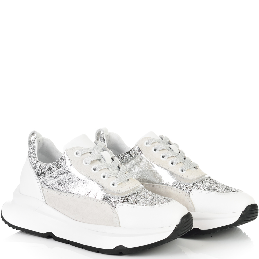 Невероятни дамски сникърси от естествена кожа в страхотно съчетание на ефектни кожи - бяла напа и сив велур в съчетание с ефектен брокат и сребриста кожа. Блясъкът винаги е на мода, а с тези кецове просто ще заблестите. Вътрешната част на модела също е изцяло от естествена кожа, а стелката е Footbed, която е изключително мека и се оформя по стъпалото на принципа на мемори пяна. В допълнение моделът е с олекотено полиуретаново ходило, шито и лепено, което перфектно допълва комфорта на модела и следва естествената линия на движение на краката. С тях ще бъдете просто неотразима.