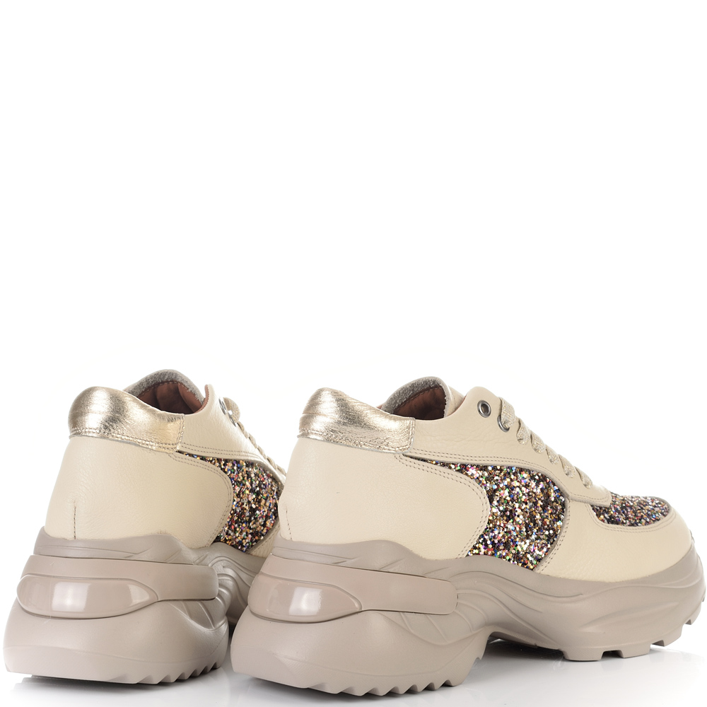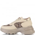 Невероятни дамски сникърси от естествена кожа - бежов шегрен в съчетание с ефектен брокат в различни цветове. Блясъкът винаги е на мода, а с тези кецове просто ще заблестите. Вътрешната част на модела също е изцяло от естествена кожа, а стелката е Footbed, която е изключително мека и се оформя по стъпалото на принципа на мемори пяна. В допълнение моделът е с олекотено полиуретаново ходило, шито и лепено, което перфектно допълва комфорта на модела и следва естествената линия на движение на краката. С тях ще бъдете просто неотразима.