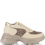 Невероятни дамски сникърси от естествена кожа - бежов шегрен в съчетание с ефектен брокат в различни цветове. Блясъкът винаги е на мода, а с тези кецове просто ще заблестите. Вътрешната част на модела също е изцяло от естествена кожа, а стелката е Footbed, която е изключително мека и се оформя по стъпалото на принципа на мемори пяна. В допълнение моделът е с олекотено полиуретаново ходило, шито и лепено, което перфектно допълва комфорта на модела и следва естествената линия на движение на краката. С тях ще бъдете просто неотразима.