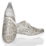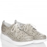 Класически модел дамски обувки на платформа с лазерна перфорация в сребърно. Перфектен избор за ежедневната ти визия, защото лесно се съчетават с всякакви тоалети от дънки и панталони до рокли и поли, също така са подходящи както за пролетта, така и за лятото, заради дупките от перфорацията. Стелката на модела е с три меки зони – пета, свод и възглавничка, а ходилото е изключително леко, защото е изработено от олекотен полиуретан, което перфектно допринася за цялостния комфорт на модела.