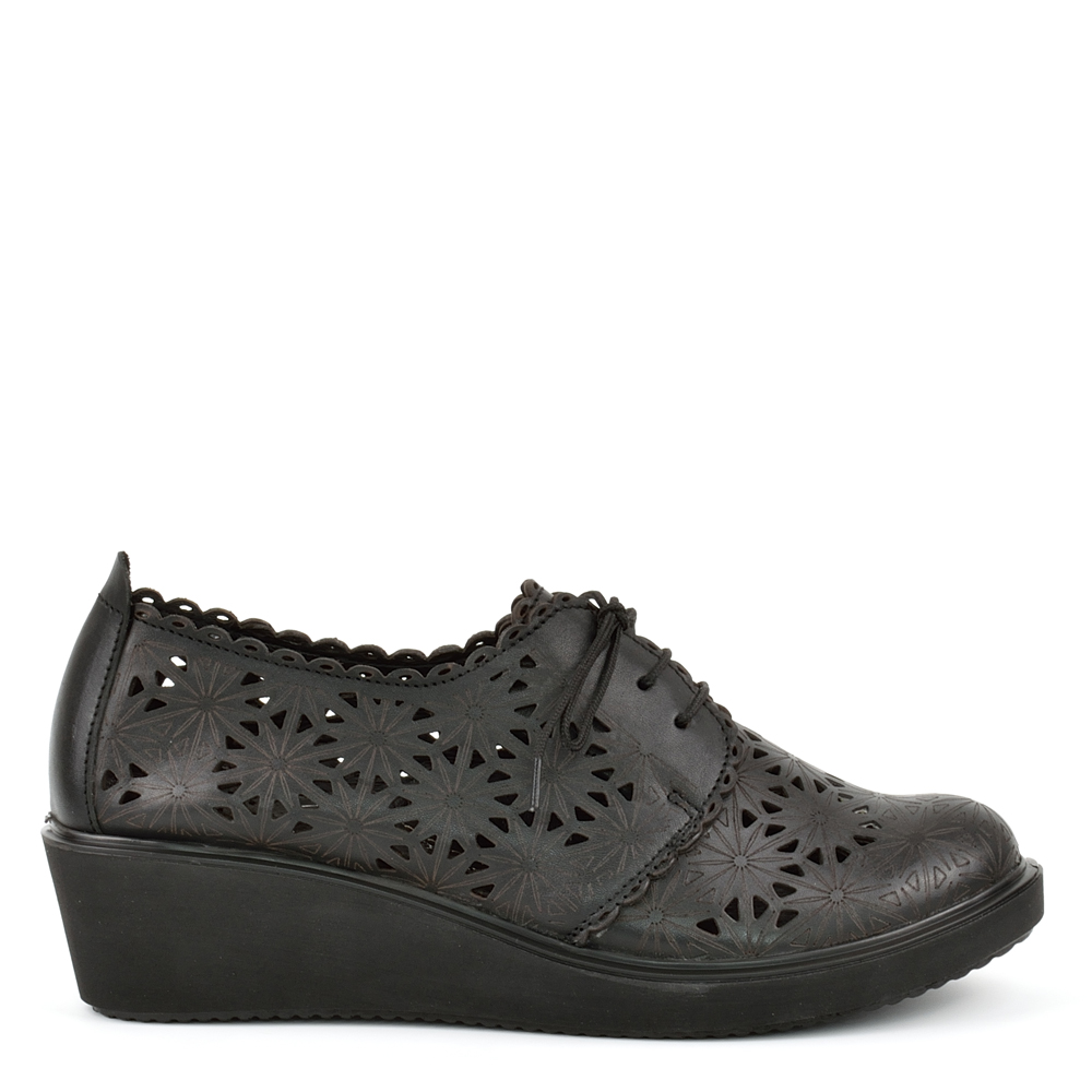 Българси дамски обувки на платформа в класическо черно с лазарна перфорация, изцяло от естествена кожа отвътре и отвън. Моделът е с анатомична подметка, меки, леки и невероятно удобни. Перфектният избор за ежедневието. Стелката на модела е с три меки зони – пета, свод и възглавничка, а ходилото е изключително леко, защото е изработено от олекотен полиуретан, което перфектно допринася за цялостния комфорт на модела.