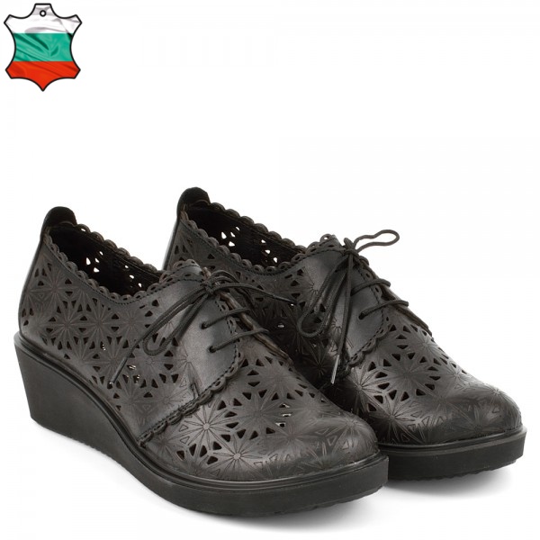 Българси дамски обувки на платформа в класическо черно с лазарна перфорация, изцяло от естествена кожа отвътре и отвън. Моделът е с анатомична подметка, меки, леки и невероятно удобни. Перфектният избор за ежедневието. Стелката на модела е с три меки зони – пета, свод и възглавничка, а ходилото е изключително леко, защото е изработено от олекотен полиуретан, което перфектно допринася за цялостния комфорт на модела.