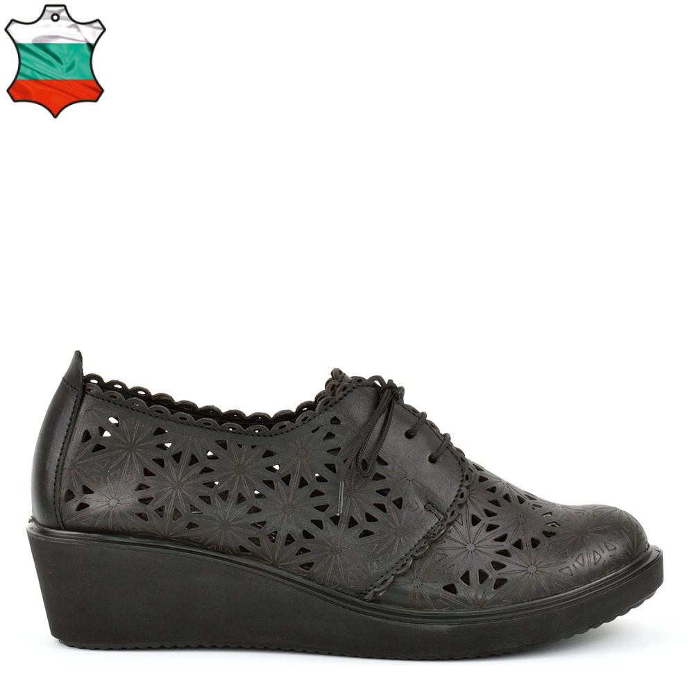 Българси дамски обувки на платформа в класическо черно с лазарна перфорация, изцяло от естествена кожа отвътре и отвън. Моделът е с анатомична подметка, меки, леки и невероятно удобни. Перфектният избор за ежедневието. Стелката на модела е с три меки зони – пета, свод и възглавничка, а ходилото е изключително леко, защото е изработено от олекотен полиуретан, което перфектно допринася за цялостния комфорт на модела.