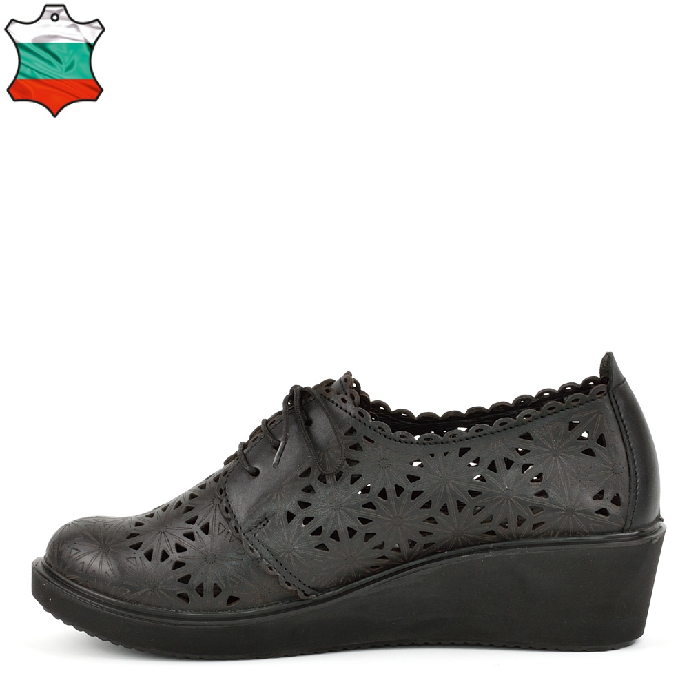 Българси дамски обувки на платформа в класическо черно с лазарна перфорация, изцяло от естествена кожа отвътре и отвън. Моделът е с анатомична подметка, меки, леки и невероятно удобни. Перфектният избор за ежедневието. Стелката на модела е с три меки зони – пета, свод и възглавничка, а ходилото е изключително леко, защото е изработено от олекотен полиуретан, което перфектно допринася за цялостния комфорт на модела.