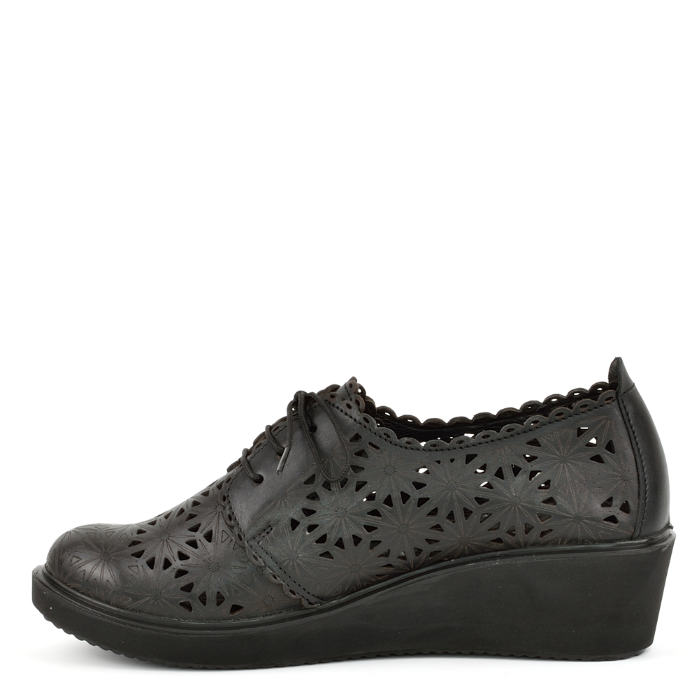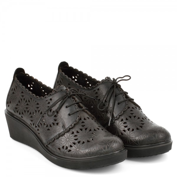 Българси дамски обувки на платформа в класическо черно с лазарна перфорация, изцяло от естествена кожа отвътре и отвън. Моделът е с анатомична подметка, меки, леки и невероятно удобни. Перфектният избор за ежедневието. Стелката на модела е с три меки зони – пета, свод и възглавничка, а ходилото е изключително леко, защото е изработено от олекотен полиуретан, което перфектно допринася за цялостния комфорт на модела.