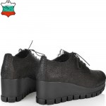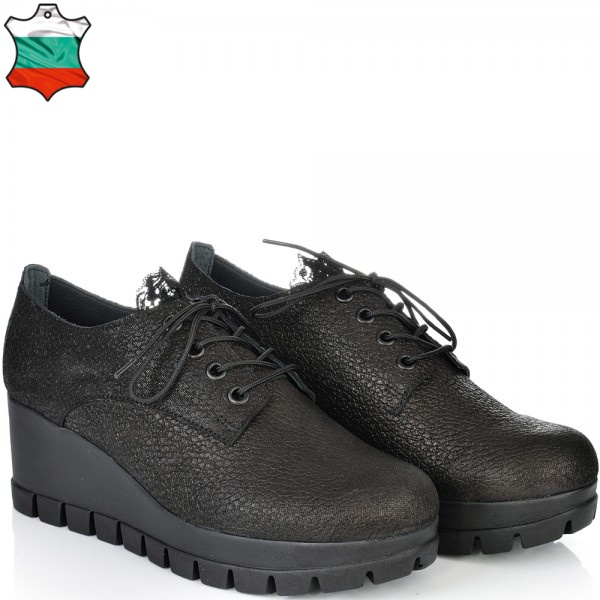 Дамски ежедневни обувки на платформа с връзки и дантела на езика в страхотна ефектна черна кожа. Моделът изключително стилен и удобен и лесно се съчетава с всякакъв тип тоалети. Стелката е мека и се оформя по стъпалото на принципа на мемори пяна. Моделът е много лек, защото е изработен от полиуретаново ходило, което следва естествената линия на движение на походк
