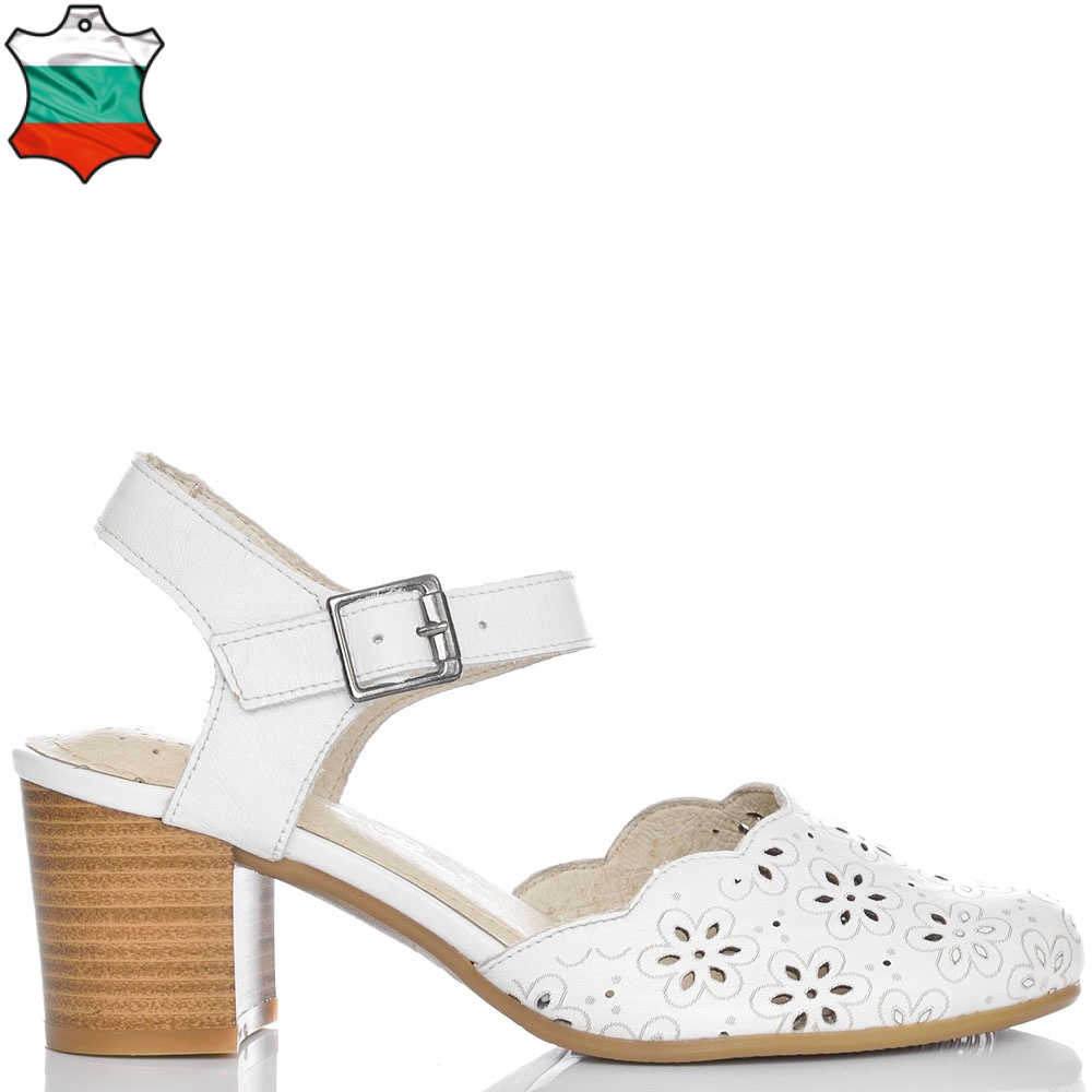 Дамски пролетно-летни бели обувки на стабилен анатомичен ток с височина 6 см. Произведени изцяло от естествена кожа в България.